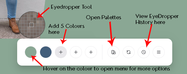 You can see the five colour spots on the far left. After the line in the middle, if you click on that first “Colour Palette” icon, it will open a new tab where you can see each of the colours in that palette in more detail, which will allow you to re-arrange colours if you want to play around with them, open Tints & Shades etc.