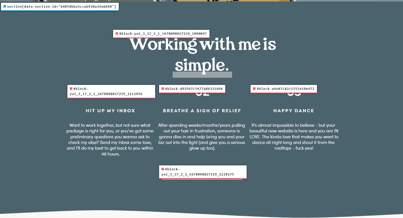 In this example above, by clicking on the Block ID that hovers over the “Working with me is simple” text, and adding this to my Custom CSS, I would have the ability to change things like the font family, font size and even make the text italicized, for that particular block only. Those changes would not affect any other similar sections across any other part of my website.