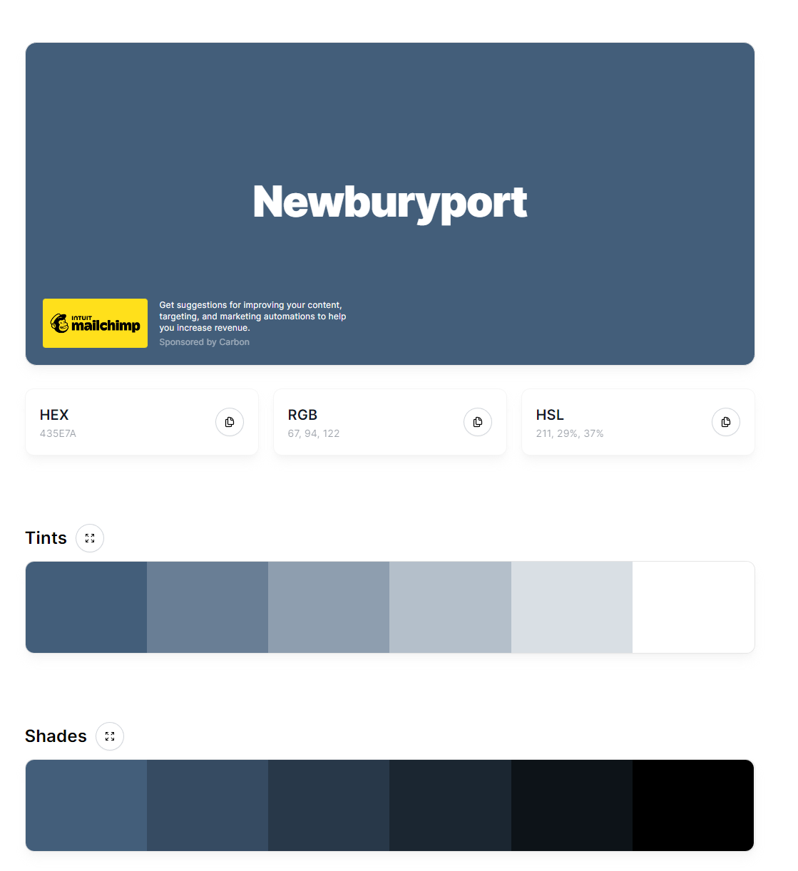 When you click on “Tints & Shades” this is what opens in a new tab for you. You can swap between Tints and Shades by clicking on the relevant option, you can change the colour, and you can also decrease or increase the number of different tints and/or shades you want. When you hover on each tint/shade, it will become bigger and the HEX code will show up and allow you to copy it if you click on the text.
